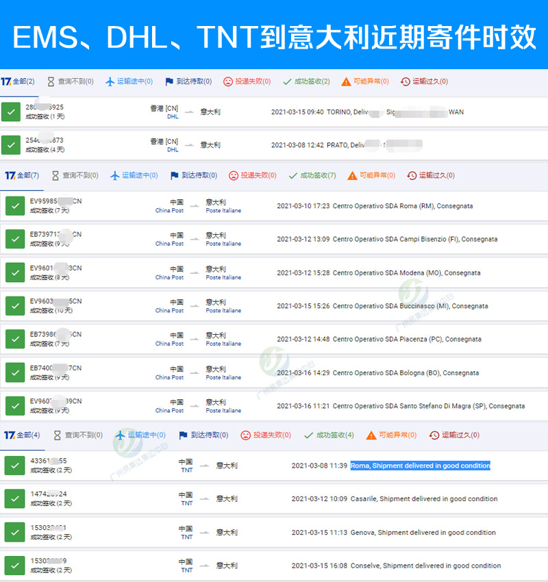 邮寄私人物品邮寄到意大利的渠道有很多,常见的有DHL、EMS、TNT及包税渠道等。
