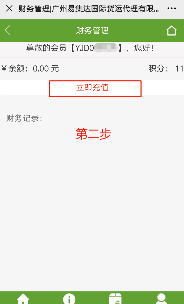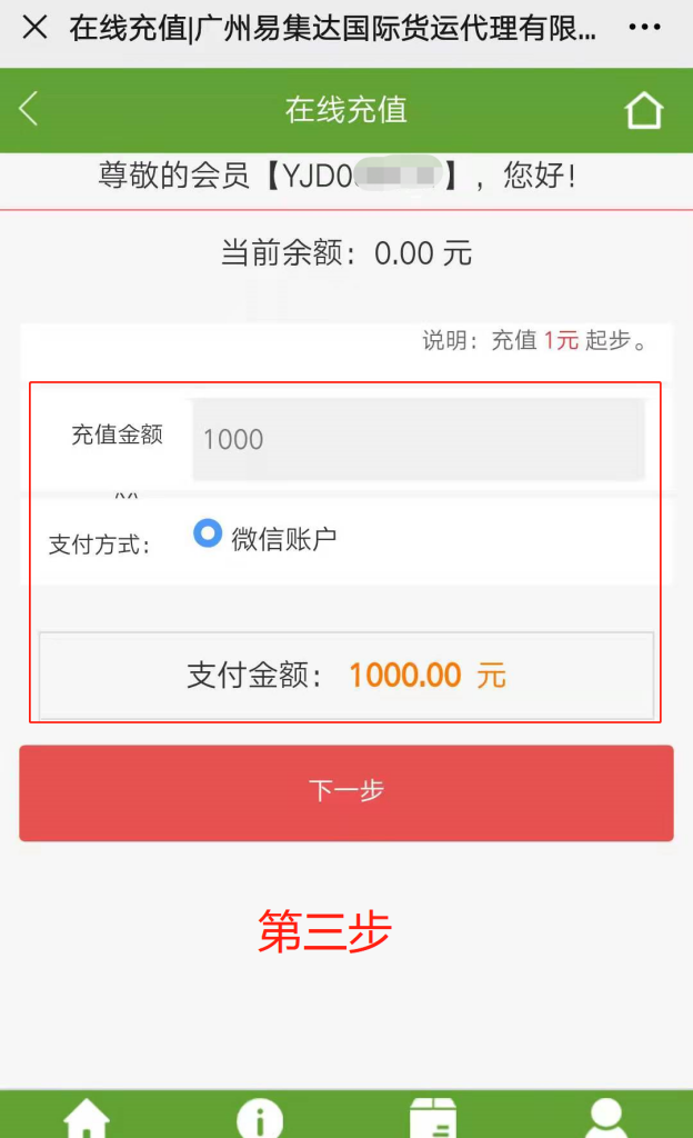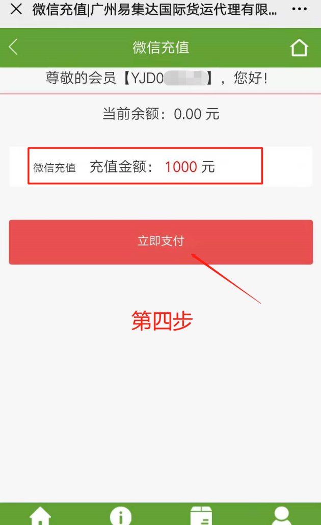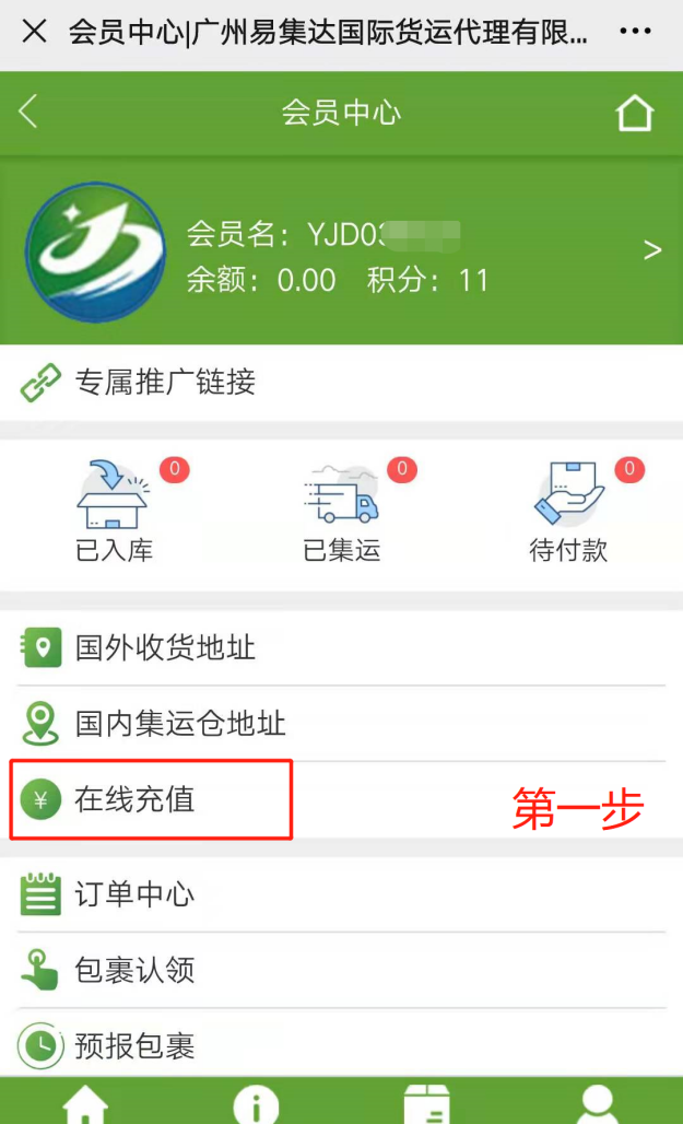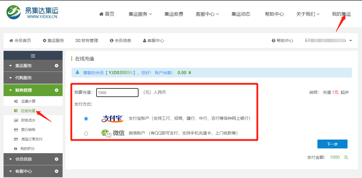 进入易集达公司网址:https://www.yjdex.cn/ ----点击“我的集运”----在线充值----输入充值金额*** 支付方式选“支付宝 ”----扫码支付