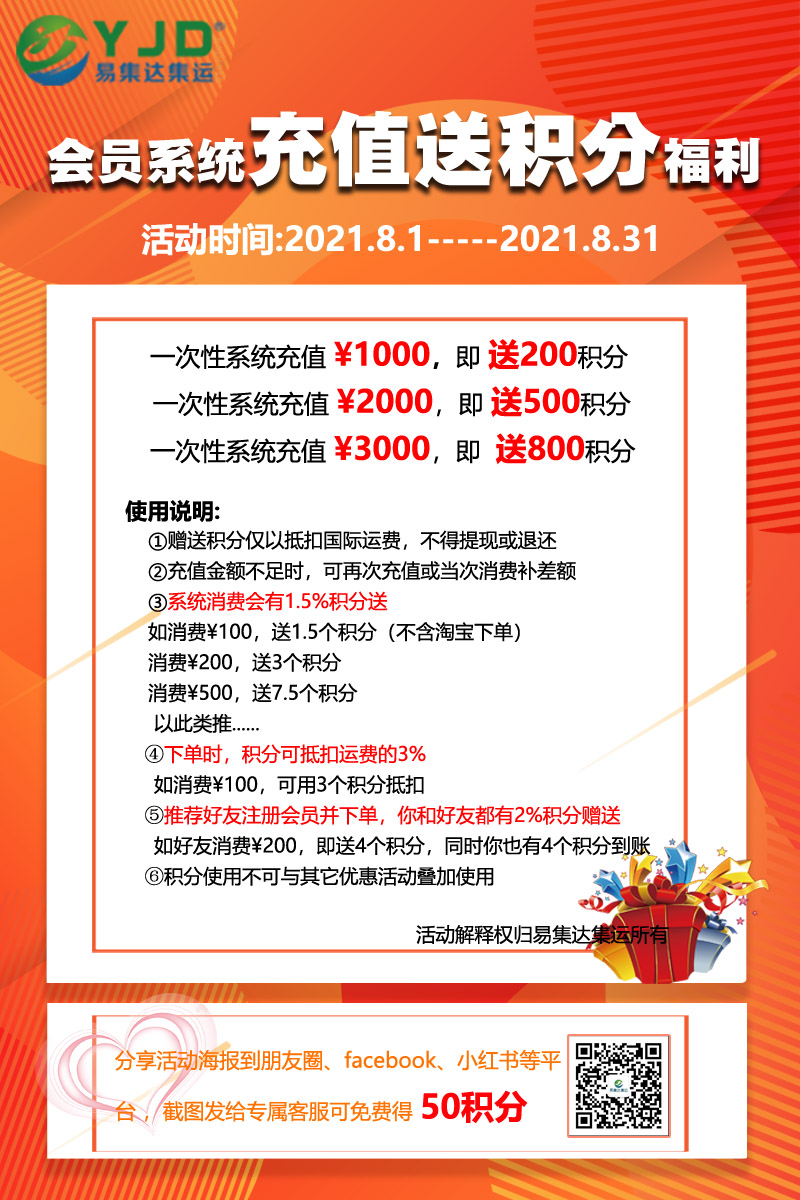 会员系统充值送积分福利来喽~ 转发活动海报免费得50积分