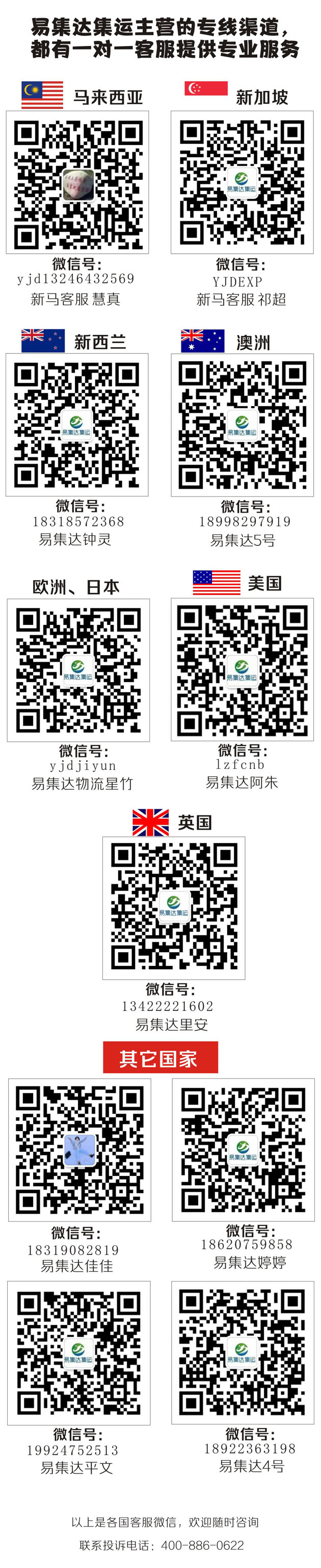 我们提供免费1对1咨询服务,客服会根据邮寄物品种类、体积、重量及目的国推荐最佳邮寄渠道及预估运费。邮寄线路多,每种路线都有优点与不足,大家可以根据邮寄物品选择或让客服推荐最佳邮寄渠道。如需详询,加客服详询